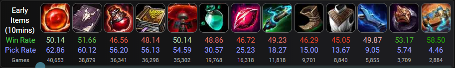 - 지금까지 제가 다뤄봤던 챔피언들은 포물선 형태나 후반 갈수록 힘이 빠지는 경우가 많았는데 블라디는 정직하게 후반으로 갈수록 고승률이 나옵니다.