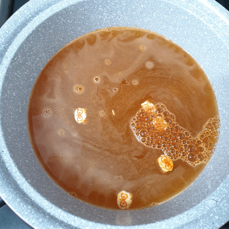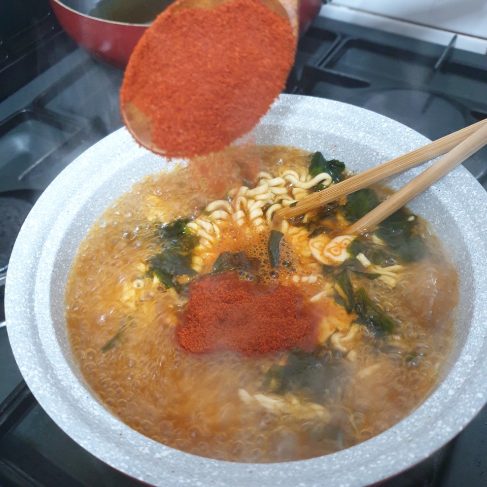 맛있으면 몰래 끓여먹을 예정이었던 남은 1개를 꺼냈습니다. 너구리에 대한 배신감만큼 고추가루를 뿌려줍니다