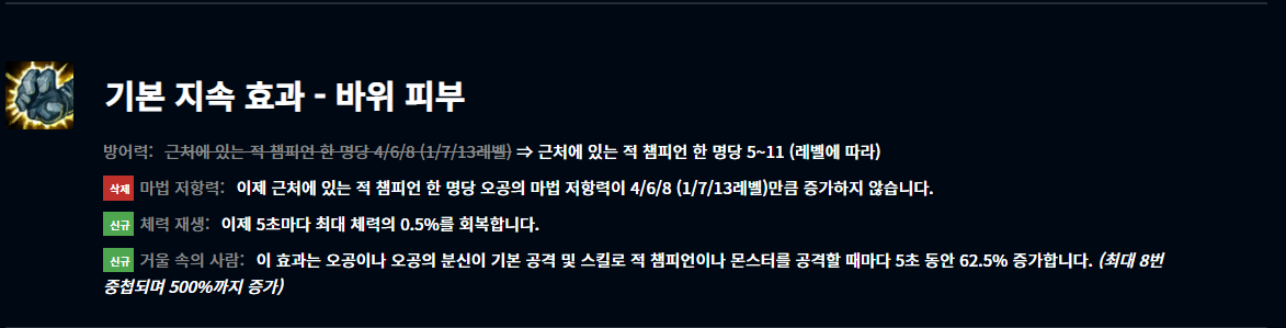 롤 챔피언 통틀어 최악의 쓰레기 패시브로 꼽히던 오공의 패시브가 바뀌었네요. 눈에 띄는건 마저 스탯 너프와 맞물려서 마저 증가가 삭제되었다는 것. 방어력 증가는 유지되었습니다. 체젠 능력을 추가로 부여받았고 패시브가 전투 중에 중첩이 된다는 엄청난 혜택까지! 종종 암살자 컨셉으로 쓰이던 오공이 라이엇의 의도대로 인파이팅 전사로 거듭날 수 있을 것 같습니다.