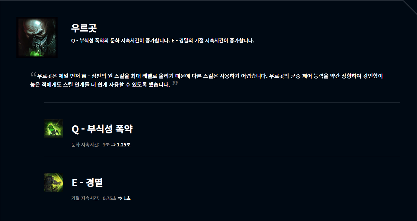라이엇의 탑 라인 상향 패치의 대부분은 '근접 전사의~'같은 수식어가 붙습니다. 근접 챔프들이 원거리 챔프들의 견제 속에서 어떻게든 살아남으면서 아이템이나 운영에 전반적인 혜택을 주는 경우인데요. 우르곳은 근접 챔피언에 속하지 못하고 그렇다고 원거리 챔프라고 하기엔 팔 한쪽 잘린 좀 불쌍한 친구입니다. 그래서 격동의 상체 메타 속에서 항상 구석에서 구경만 해야 했는데 이번에 W 스킬 선마를 바탕으로 Q, E스킬의 유틸적인 부분에 상향을 받았습니다.