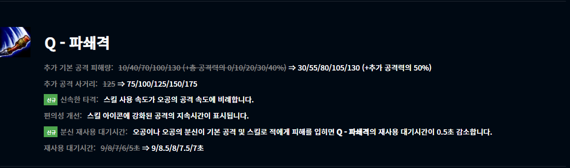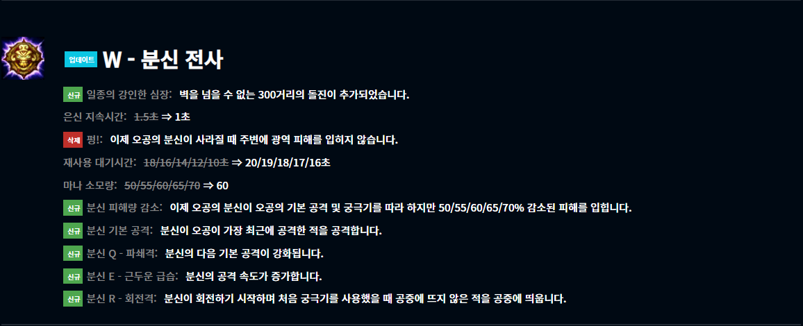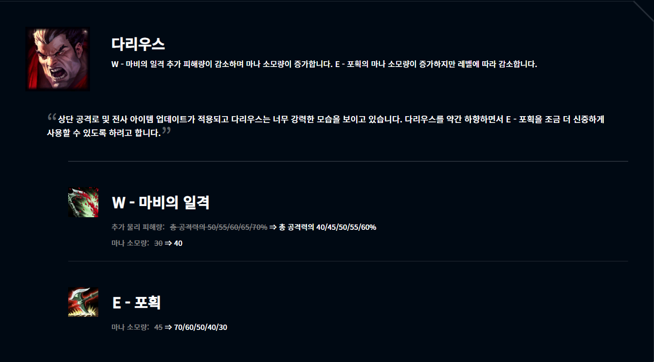 상위티어에서는 다리우스가 잘 나오지도 않고 하위권 티어에서만 깡패라는 인식이 아직까지 있는데 다리우스는 분명히 OP급 챔피언이었습니다. 어찌어찌해서 1~2 킬 앞서 나가고 있어도 순간의 실수 한 번으로 킬을 헌납하는 상황이 자주 나오는데요. 이거 진짜 스트레스죠. 챔프 스펙 자체도 좋고 지금까지 너프가 없던 다리우스인데 이번에 W, E의 딜, 코스트가 너프 되었네요. 얘 너무 얄미워서 포스팅도 안 했었는데 10.6 패치가 조금 지나면 한번 포스팅할 예정입니다.