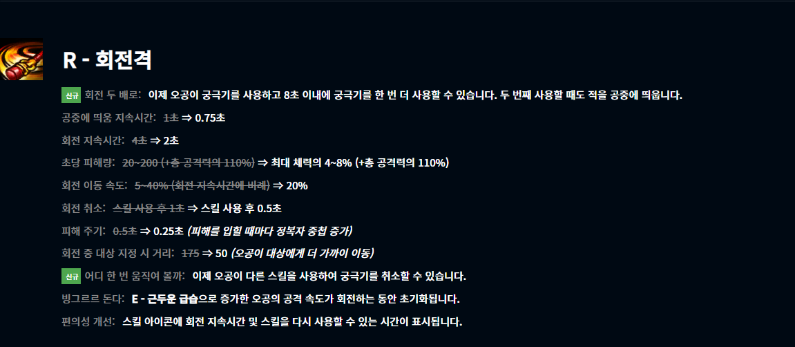 이제 두 번 눌러서 캔슬이아니라 다른 스킬 사용 후 재사용이 가능해졌습니다. 한타 진영 파괴라는 컨셉을 유지하면서 더욱 강화된 느낌이네요. 에어본 CC를 한타 때 두 번을 별다른 페널티 없이 넣을 수 있다는 것 하나만으로도 엄청난 상향입니다.