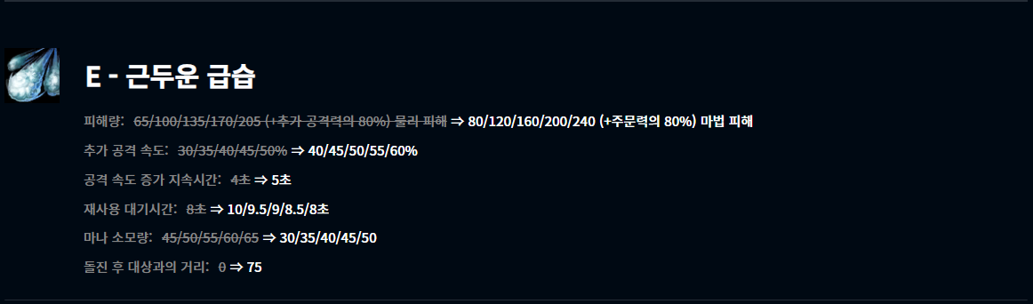 눈에 띄는 것은 계수가 AD에서 AP로 변경되었다는 점. 지금까지의 내용을 보았을 땐 블클보단 트포가 효율적으로 보입니다. 추가 공속과 지속시간이 상향되었고 마나 코스트까지 깎였으니 여러모로 혜택만 본 스킬이지만 역시 Q 선마가 좋아 보입니다.