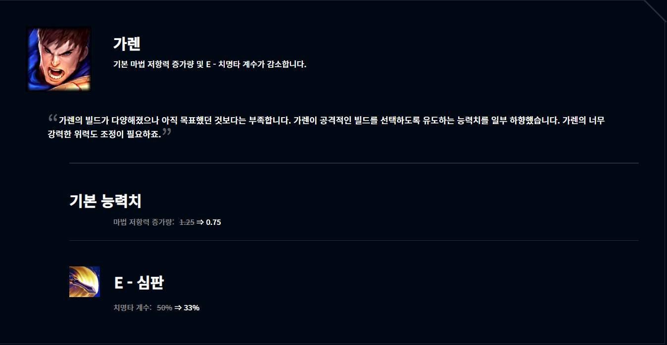 가렌도 다리우스랑 비슷한 소견입니다. 다리우스 외에는 딱히 카운터라고 할 수 없을 정도라서 막강한 OP 챔피언의 위용을 뽐내고 있는 가렌... 마저 하향은 미드 가렌을 겨냥한 것 같고 치명타 빌드를 올리는 가렌에게 조금 너프가 아플 수 있겠지만 체젠, 공속 스탯을 건드린 게 아니라서 치명타 빌드를 안 타면 그만이라는 의견이 지배적입니다. 역시 좀 지켜볼 필요는 있겠지만 큰 영향은 없는 정도겠네요.