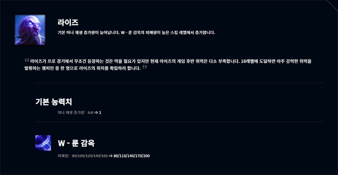 패치의 칼을 많이 맞은 챔프 중 하나 라이즈. 마나 리젠 버프와 W 딜이 약간 상향되었지만 이정도로는 포악한 짐승들이 날뛰는 탑 라인에서 살아남을 수 있을까 의문이 듭니다.