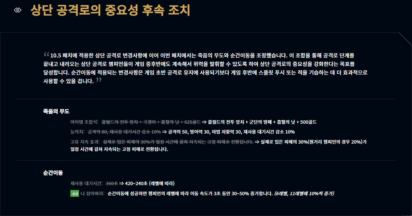 마지막으로 죽무와 텔레포트의 변경이 있었습니다. 변경된 죽무는 쿨감과 방/마저 향상 효과까지 있어서 스노우볼 굴리기에 더욱 최적화되었네요. 텔포 역시 후반 운영 중 한타 합류 시에 더욱 용이하게 변경되었습니다.