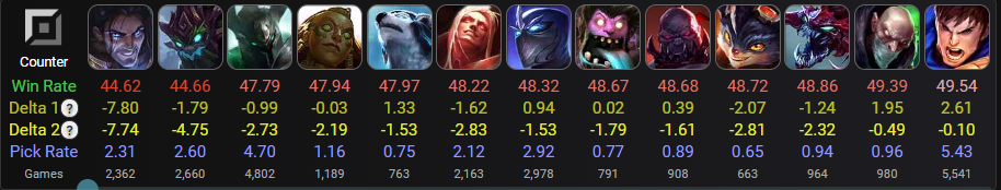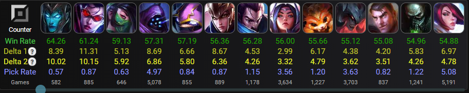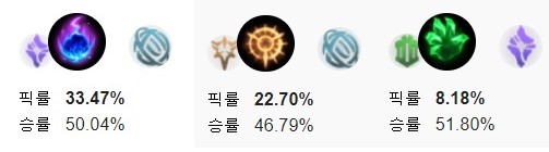 국내 롤 전적 사이트 op.gg 기준 픽률과 승률이 유성과 집공에 비해 밀리는 모습입니다.
