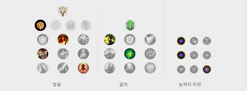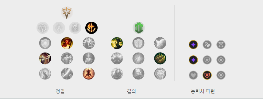 - 위에 두 가지를 보통 고정으로 하고 상대가 원거리 챔프면 핵심 룬 '집공'에 부룬 '재생의 바람'을 선택해주는 게 일반적입니다