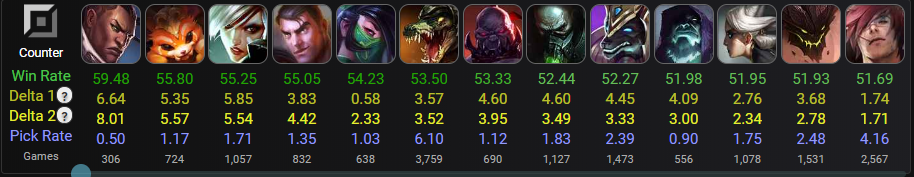 - 앞에서부터 10.8 패치 이후 오른의 상대로 가장 많이 등장한 챔피언이고 승률도 확인할 수 있습니다