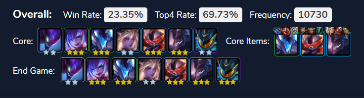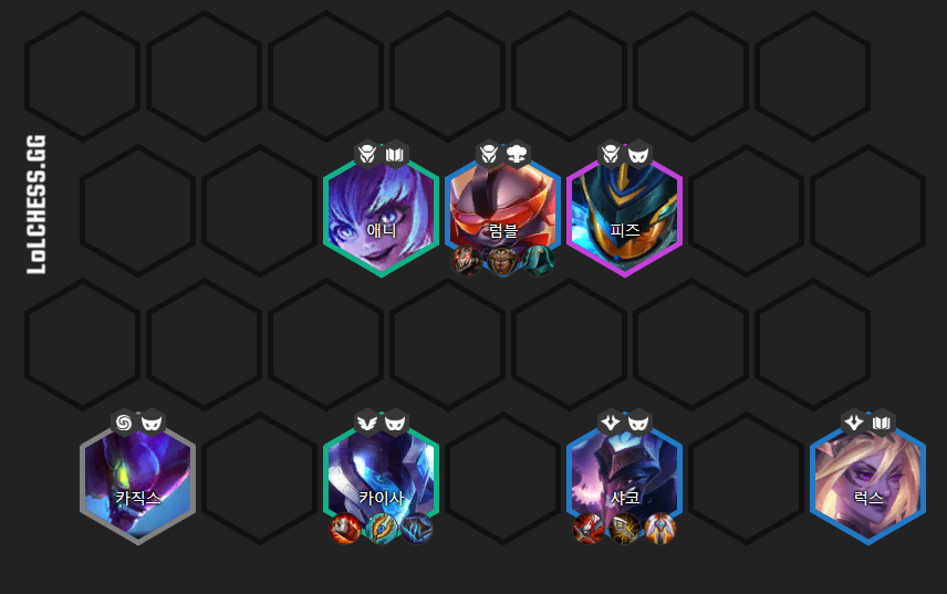 샤코가 너프가 되긴 했어도 메카 잠입 시너지는 계속 고승률을 유지 중입니다. '카이사-샤코-피즈-에코'로 이어지는 4잠입자에서 코스트를 좀 줄이고 '카직스-카이사-샤코-피즈'로 4잠입자를 받는 덱인데요. 샤코와 더불어 카이사가 핵심 유닛으로 두 유닛 다 3성을 찍어줘야합니다. 하지만 1티어 덱은 당연히 판 당 경쟁률이 있기 때문에 눈치싸움을 잘해야하는 게 포인트! 레벨 5~6구간에서 피 관리를 잘하면서 카이사와 샤코를 3성찍어주셔야 합니다. 극초반에 카직스, 카이사, 애니가 잘 뜬다? 메카 4잠입자 각을 보시는 게 괜찮을 것 같습니다