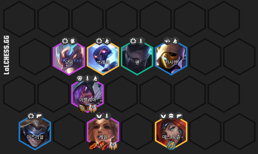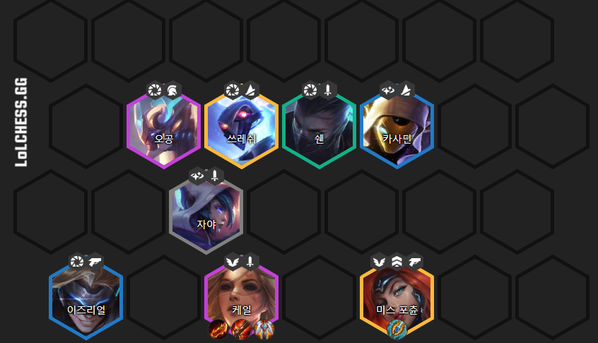 개인적으로 제가하면 잘 안풀리고 남이하면 1등하던 덱입니다. 이렐이 잘 뜨면 자야의 벨류가 낮기 때문에 교체해주시는게 좋습니다. 럭키 이렐이라도 뜨면 카사딘과의 마나약탈자 시너지로 초반 운영이 확실히 쉽다는 장점이 있고 메인 딜러인 케일의 아이템이 제일 중요하기 때문에 곡궁 계열 아이템을 잘 선점해야하는 것이 포인트입니다. 천상계 고수분들의 플레이를 보면 메인 딜러인 케일과 더불어 메인 탱커 쉔의 배치를 많이 신경쓰시더라고요. 상대 배치를 보시고 쉔이 최대한 오래버티면서 케일이 프리딜을 넣을 수 있는 구도를 만들어주셔야됩니다