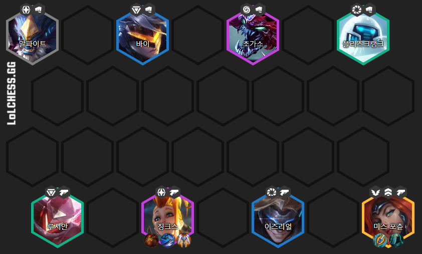 제가 제일 좋아하는 덱ㅎㅎ한참 선봉진과 메카잠입에 가려져서 티어가 내려갔을 때 남몰래 꿀빨았는데 알고보니 저만 빨고있었던 게 아니었어요 🤔 쌈총을 저격할만한 덱들이 너프되고 공수의 안정성, 초반 운영이 쉽고 후반 뒷심도 약하지 않아서 많은 유저들이 선호하는 덱입니다. '말파이트-블리츠크랭크-바이-초가스' 4싸움꾼, '그레이브즈-루시안-이즈리얼-징크스' 4총잡이 고정에서 '아우렐리온 솔'을 더해서 3반군 시너지를 받아도되고, '에코'를 더해서 3사이버네틱을 받으셔도됩니다.