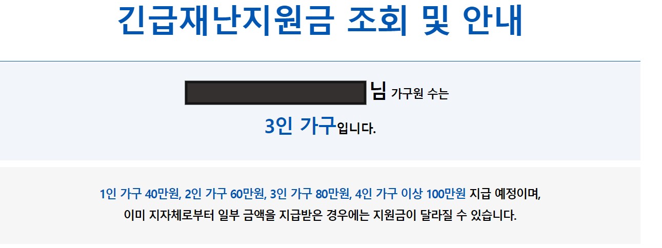 1인가구 40만원, 2인가구 60만원, 3인가구 80만원, 4인가구 100만원으로 위에 긴급재난지원금 조회 사이트를 통해 확인이 가능합니다